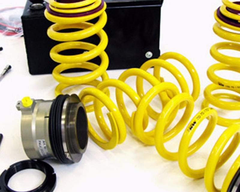 The lift kit "HLS 2" is only installed on the front axle. A hydraulic cylinder is installed between spring plate and springs of each KW strut. The great advantage of the hydraulic system is that driving dynamics are not affected. The delivery content for all HLS lift kit versions include a control unit, which is connected to the vehicles on-board electronics. The vehicle will be automatically lowered at a certain speed to the original level of the KW coilover kit or your series suspension.